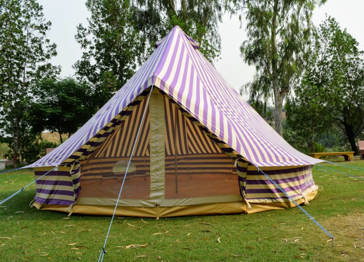 Cotton canvas flysheet with Separate groundsheet, 4m diameter, 1.5m entrance, 2.5m at centre, weight 24kg.