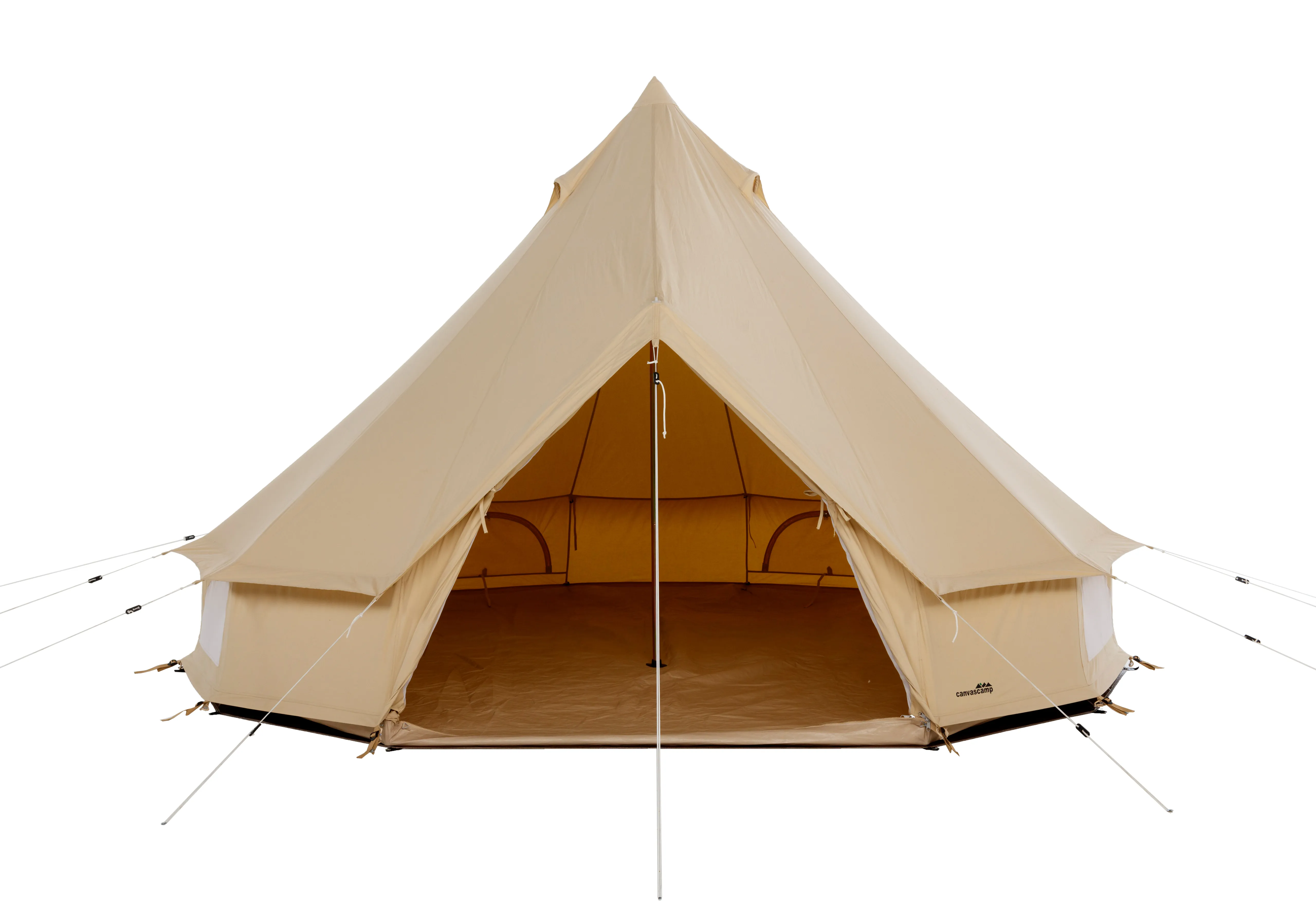 The central tent pole and A-frame for the door are made of nickel-plated steel, and are spring-loaded for easy assembly. A cleverly designed central pole protects the tent and has an eye at the top for attaching lamps or other items.
